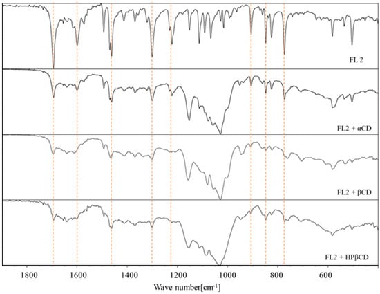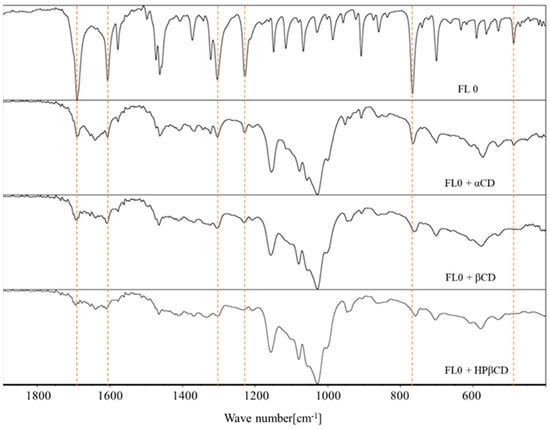 In the spectra of the complexes (Figure 7 and Figure 8), a decrease in the characteristic bands of the flavanones was observed. Changes in the FT-IR spectra were also observed by Kim [39] and Qiu et al. [40]. The authors observed displacement, reduction, and disappearance of the peaks in the complex of cyclodextrin. This indicates the inclusion of flavanone molecules in the hydrophobic interiors of the macrocycles. The characteristic bands of flavanones are more visible in complexes with α-cyclodextrin compared to those of complexes formed by beta and hydroxypropyl-β-cyclodextrin (FTIR spectrum of pure cyclodextrins in Supplementary Materials). This may indicate that fewer ligand molecules stably bind to α-cyclodextrin in comparison to its larger derivatives and consequently confirm the formation of more stable complexes using the β form, in which more flavanone molecules have been incorporated.