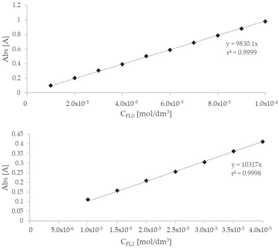 Spectrophotometric studies were conducted using the single-beam UV-Vis spectrophotometer SPECORD 50 (Analytik Jena, Jena, Germany). The maximum absorption of ethanolic solutions of flavanone FL0 and FL2 was marked at a wavelength of 256 nm. The calibration curve for the drugs was established for the concentration range from 1.0 × 10−5 M to 1.0 × 10−4 M. The determined molar extinction coefficient of flavanone was 9830.1 M−1cm−1 (Figure 10). The solubility in the water of this compound, established experimentally, was 12.33 mg/L (S0 = 5.5 × 10−5 mol/dm3). For 4′-chloroflavanone, the molar extinction coefficient was 10,317 M−1cm−1 and the solubility in pure water was 1.42 mg/L (S0 = 5.5 × 10−6 mol/dm3).