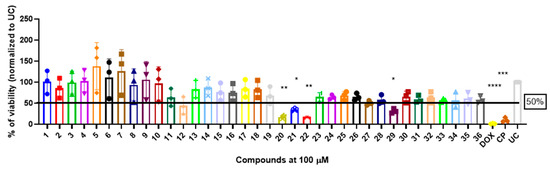 The (4-hydroxyphenyl)amino)propanoic acid derivatives 1–36 are able to induce the cytotoxicity in A549 cancerous cells. The cells were exposed with compounds 1–36 or doxorubicin (DOX) and cisplatin (CP) for 24 h and the viability was determined using MTT assay and normalized to untreated control (UC). The data are expressed as mean ± standard deviation of tree experimental replicas. The significance of the data was determined using a one-way ANOVA test. * p < 0.05, ** p < 0.01, *** p < 0.0002, **** p < 0.0001.