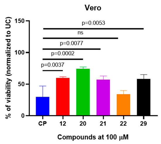After performing the initial screening and selecting the most potent compounds that reduce A549 cell viability by 50%, we selected compounds 12, 20–22, and 29 for further cytotoxicity characterization. To determine whether the observed cytotoxicity in A549 cells is specific to cancerous cells, we used noncancerous Vero cells for the cytotoxicity evaluation. Treatment with compounds 12 and 20, 21, and 29 resulted in significantly higher Vero cell viability compared to the cisplatin-treated Vero cells (p < 0.05) (Figure 2). Compound 22 showed no significant difference in Vero cell viability reduction compared to cisplatin, suggesting that compound-22-induced cytotoxicity to noncancerous Vero cells is similar to cytotoxicity induced by cisplatin.