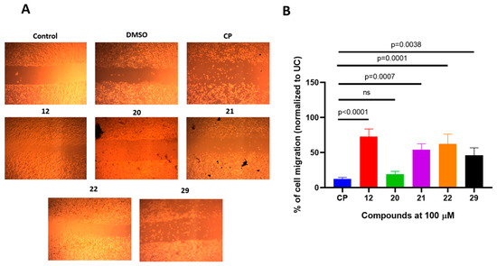 After selecting the most promising anticancer candidates among the 3-((4-hydroxyphenyl)amino)propanoic acid derivatives, we evaluated whether these compounds could suppress A549 cell migration. Cancerous cell migration is paramount for systemic multi-organ spread; therefore, novel compounds should contain properties that could reduce cancerous cell migration. To do so, we employed a well-established cell migration assay following mechanical disruption of the cell monolayer, followed by treatment with a fixed concentration of the test compounds (Figure 3A,B). All selected compounds significantly reduced A549 cell migration compared to the DMSO-treated control (p < 0.05). Cisplatin (CP) induced significantly higher suppression of A549 migration than compounds 12, 21, and 22. Furthermore, compound 20 demonstrated the most promising A549 migration suppression activity, which was comparable to that of CP.