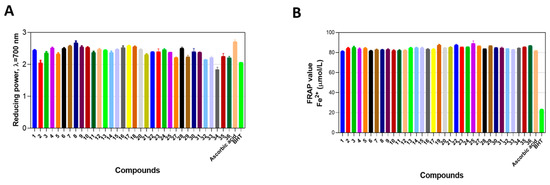 The ferric ion (Fe3+) reducing antioxidant power of compounds 1–36 was evaluated and compared to ascorbic acid and the commercial antioxidant butylated hydroxytoluene (BHT). In this assay, ascorbic acid exhibited the highest antioxidant activity and was used as a control.