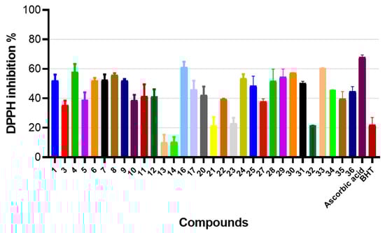 After characterizing the antioxidant activity using iron-based assays, we further evaluated the antioxidant properties of compounds 1–36 using the DPPH radical scavenging assay.