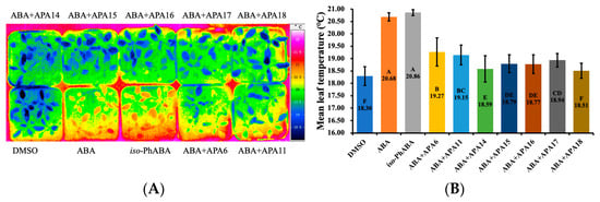 (A) Impacts of different treatments (in the presence of 5 μM ABA, iso-PhABA, or 5 μM ABA + 25 μM of APAn) on stomatal movement in A. thaliana (infrared thermography photos); (B) average leaf temperature of A. thaliana under different treatments. Values represent means ± SD, and those marked with the same letter are statistically significant (p < 0.05).