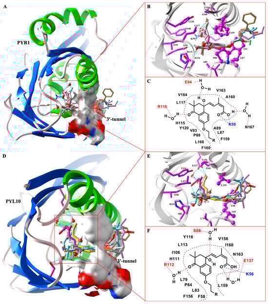 Analysis of docking-binding modes of compounds ABA, iso-PhABA, APAn with PYR1 (A–C) and PYL10 (D–F). Hydrophobic surfaces rendered in (A,D) formed by 3′-tunnel amino acid residues. Polar interactions are connected with cyan straight lines. The hydrophobic amino acid residues comprising the 3′-tunnel in (B,E) are highlighted with a ball-and-stick model.