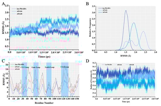To further demonstrate the reliability of the molecular docking results and the stability of the complexes, molecular dynamics simulations of the ligand–PYL10 system were performed. During molecular dynamics simulations, all systems were continuously optimized until equilibrium was reached, and analysis of the entire simulation process helped to provide a comprehensive understanding of the ligand–receptor interaction patterns. The equilibrium of the molecular dynamics simulations was judged according to the root mean square deviation (RMSD) values of the main chain carbon atoms. Figure 5A,B show the variations of RMSD with time for different systems. From Figure 5A, it can be found that the RMSD values of the APA16-PYL10 and APA18-PYL10 systems gradually increased throughout the simulation and tended to converge and equilibrate until 20 ns, indicating that all three systems had reached a steady state. The mean RMSD values of stabilized iso-PhABA-PYL10, APA16-PYL10, and APA18-PYL10 were 1.52 Å, 2.45 Å, and 1.97Å, respectively. Among them, the relative frequencies of distribution of RMSDs for APA16 and APA18 were greater than that for iso-PhABA, which may be due to the fact that they had long tail chains. Figure 5C shows the changes in RMSF for each system during the simulation. Overall, the volatility of amino acid residues was less than that of iso-PhABA in both the APA16-PYL10 and APA18-PYL10 systems, suggesting that these two compounds bind more stably to the receptor. Of the four free loops where the ligand enters the cavity, the CL1 and latch loops fluctuated less, suggested that they may have been involved in the interaction with the ligand. Further Rg analysis revealed (Figure 5D) that the Rg value of iso-PhABA was stable overall, whereas the Rgs of both APA16 and APA18 were initially lower than that of iso-PhABA and gradually approached that of iso-PhABA as the simulation time continued after 20 ns.