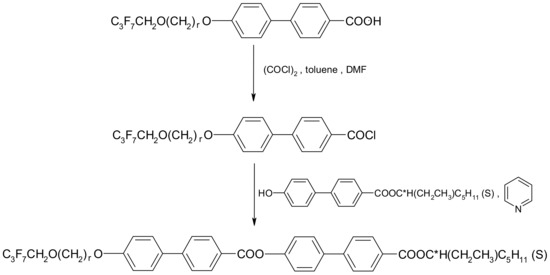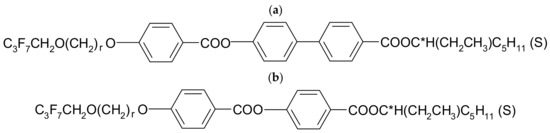 - Drzewiński, W.; Czupryński, K.; Dąbrowski, R.; Neubert, M. New antiferroelectric compounds containing partially fluorinated terminal chains. Synthesis and mesomorphic properties. Mol. Cryst. Liq. Cryst. 1999, 328, 401–410. [Google Scholar] [CrossRef]