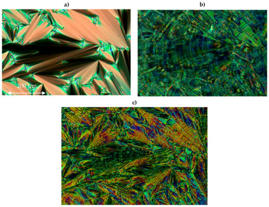 - Bubnov, A.; Hamplová, V.; Kašpar, M.; Vajda, A.; Stojanović, M.; Obadović, D.; Éber, N.; Fodor-Csorba, K. Thermal analysis of binary liquid crystalline mixtures: System of bent core and calamitic molecules. J. Therm. Anal. Calori. 2007, 90, 431–441. [Google Scholar] [CrossRef]