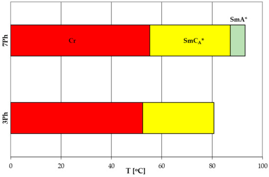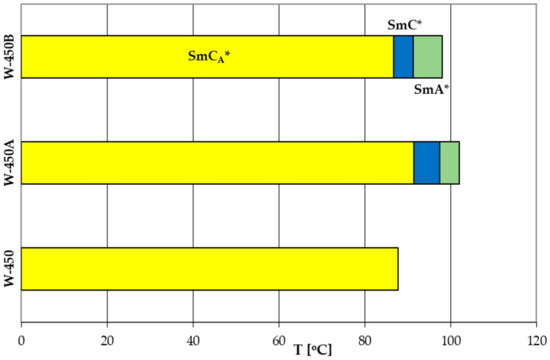 - Fitas, J.; Marzec, M.; Szymkowiak, M.; Jaworska-Gołąb, T.; Deptuch, A.; Tykarska, M.; Kurp, K.; Żurowska, M.; Bubnov, A. Mesomorphic, electro-optic and structural properties of binary liquid crystalline mixtures with ferroelectric and antiferroelectric liquid crystalline behaviour. Phase Trans. 2018, 91, 1017–1026. [Google Scholar] [CrossRef]