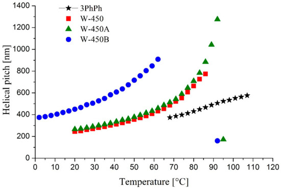 - Furue, H.; Umeno, E.; Hatano, J. Temperature Dependence of Helical Structure of Polymer-Stabilized Antiferroelectric Liquid Crystals. Mol. Cryst. Liq. Cryst. 2005, 437, 203–209. [Google Scholar] [CrossRef]