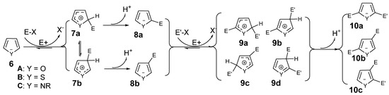 As is well known, electrophilic substitution reactions can proceed in a similar way with hetero-analogues of benzene, such as furan (6A), thiophene (6B) and pyrrole (6C) and a variety of their derivatives (Scheme 2) [8]. Here, the electrophilic attack of the appropriate electrophile E-X can take place both at their 2- and 3-position, so that Wheland intermediates with isomeric structures 7a and 7b are formed, leading to two different substitution products 8a and 8b after deprotonation. Moreover, a repeated reaction with a further electrophile E’-X can occur with formation of di-substitution product 10a–10c via intermediates 9a–9d depending on the types of electrophiles used.