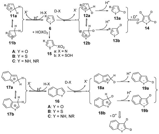 For furan (6A), an acid-catalysed D/H-exchange occurs in methanolic sulphuric acid at 20 °C [77]. All experiments with deuterated acids indicate an H/D exchange at both the alpha and beta positions of the heterocycles 6A and indicate, therefore, the intermediate formation of the cationic compounds 11a and 11b as well as 12a and 12b (Scheme 3). In some cases, the relative extent of this H/D exchange has been estimated by means of usual 1H NMR measurements [76].