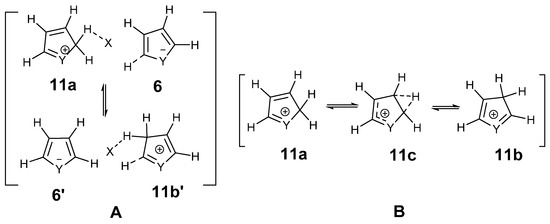 Consistent with this result, a proton exchange between different ring positions in the corresponding proton adducts of heteroaromatic compounds 6 takes place. Thus, the proton adducts (11) differ in the site of proton attachment resulting from disagreement between kinetic and thermodynamic stability [56,57]. This proton exchange can occur in different ways, e.g., through a (bimolecular) intermolecular exchange reaction between 11 and the parent heterocyclic component (6) mediated by the acid H-X (Scheme 5, version A) or via a (monomolecular) intramolecular proton exchange via a three-ring proton σ-complex (Scheme 5, version B). Therefore, statements on the reactivity of these compounds are only correctly possible if these circumstances are taken into account. However, no detailed studies in this respect have been undertaken so far.