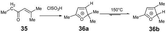Alkyl group migration can also occur at some furan derivatives. For example, the trimethyl-substituted furylium cation (36a), which is formed through treatment of mesityl oxide (35) with chlorosulphonic acid, is transformed into the isomeric furylium cation 36b following a methyl transfer at 150 °C [68] (Scheme 7).