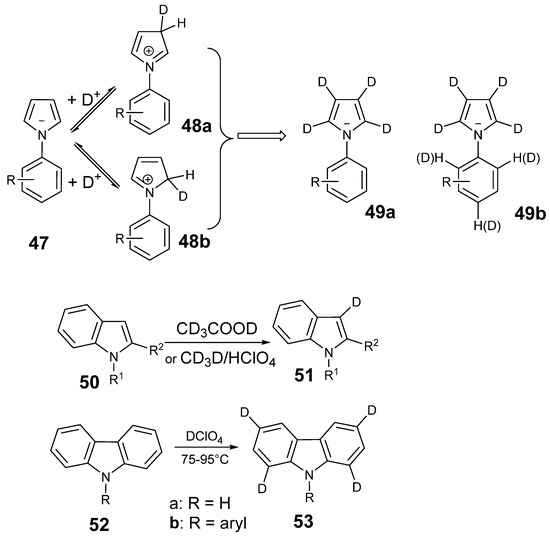 An interesting phenomenon is observed in H/D exchange reactions with N-arylpyrroles 47 when treated with deuterated TFS [31]. Mixtures of analogously deuterated compounds 49a and pyrroles 49b with partly deuterated phenyl-substituent are generated (Scheme 10).