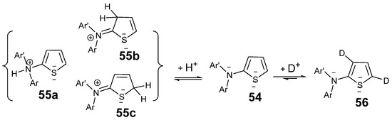 In this context, it should be mentioned that the formation of proton adducts was also observed with N,N-diaryl-substituted 2-aminothiophenes 54 [81]. These compounds were protonated through treatment with TFS not only at their N-atom but also at C5.