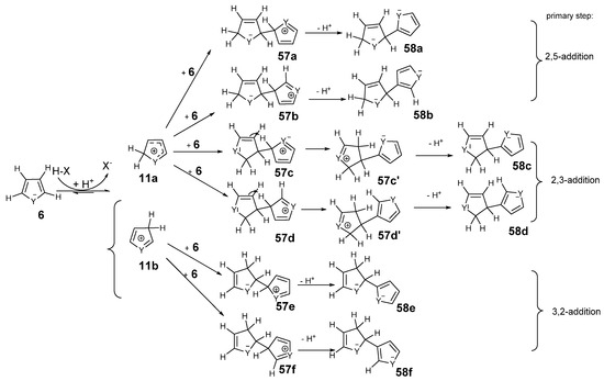 Obviously, all these reactions are initiated by the formation of the proton adducts 11a and/or 11b (Scheme 3), which exhibit significant electrophilic character. This property enables these compounds to react with their non-protonated parent compounds 6 as species with decidedly nucleophilic character (Scheme 12). Thereby, six different products 58a–58f can be formed primarily. Their structures depend on the ring positions involved in the coupling reactions. Thus, by coupling of the proton adduct 11a at C5 with the parent compound 6 at C2 or C3, the dimers 58a and 58b are formed via the corresponding primarily generated adducts 57a and 57b, respectively, in the course of a 2,5-addition at the heterocyclic starting compound 6.