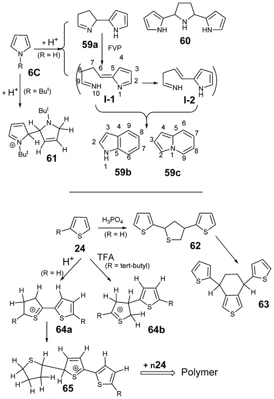 However, such restriction does not exist with simple heteroaromatic compounds non-substituted at their heteroaromatic core. Thus, pyrrole (6C) is transformed into a trimer of the structure 60 besides some polymeric compounds via treatment with simple mineral acids, such as with aqueous hydrochloric acid for 30 s [82,83]. Cations 11a and 11b (Scheme 12) will primarily form when reacting with unprotonated pyrrole (6c). However, only the dimer 59a was obtained when pyrrole was treated with aqueous HCl at 0 °C for 5 s. At higher temperature, under flash vacuum pyrolysis, this compound could be transformed into indole (59b) and indolizine (59c) [84] (Scheme 13).