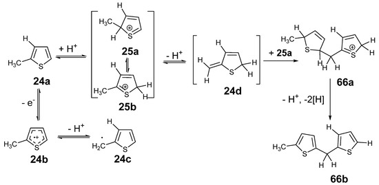 Another result was obtained if 2- or 3-methylthiophene was treated with zeolites at higher temperature [61]. Thereby, not only a migration of the methyl groups as discussed in Scheme 6 can occur but also a dimerisation under incorporation of the methyl groups arises. The mechanism depicted in Scheme 14 can be assumed. 2-Methylene-2,5-dihydrothiophene (24d) can be assumed as an intermediate in this methylene bridging. An alternative mechanism also seems possible involving the primary formation of the radical cation 24b that is transformed into the radical 24c and subsequently attacks a parent thiophene under formation of a dimeric compound (Scheme 14).