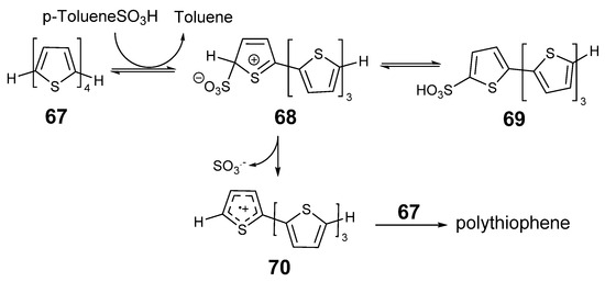 The polymerisation of tetrathiophene (67) can be accomplished by using para-toluenesulphonic acid at about 100 °C in the gas phase [91] (Scheme 15). It was assumed that under this condition, the p-toluenesulphonate can split into toluene and SO3 that generates the corresponding adduct 68. This adduct can be either transformed into the corresponding thiophene-2-sulphonic acid derivative 69 [91] or splits into the radical anion (SO3−) and the thiophene radical cation 70, which start a polymerisation by reaction with the starting thiophene oligomer (67). Under the same condition, terthiophene can also be polymerised [92].