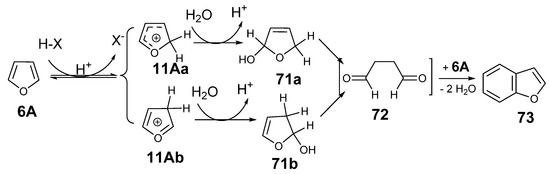 C2 protonated species 11Aa and 11Ca were generated from furan (6A) and pyrrole (6C) through chemical ionization MS spectrometry where CH5+ or C2H5+ served as protonating agents [35,36]. Proton adducts of furans 6A could also be indicated as Wheland intermediates in the mass spectrometer by the reaction of the parent compounds with gaseous CH3+ [37]. Proton adducts of furans generated through HCl-catalysed cyclisation of 2,5-alkanediones have been detected with mass spectroscopy, while also estimating the relative stability of the isomers was possible [38].