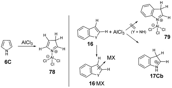 Proton adducts have also been revealed for a variety of electron-rich benzo-condensed 5-ring heteroaromatics 16 (Scheme 3). Thus, definite proton adducts of the structure 17Cb were observed after treatment of some indoles (16C) with conc. H2SO4 [43], phosphoric acid [44], trifluoracetic acid [45], HClO4 [46] or super acids [47]. In all cases, the proton is added at C3 of the indole giving rise to the formation of the proton adduct 17Cb.