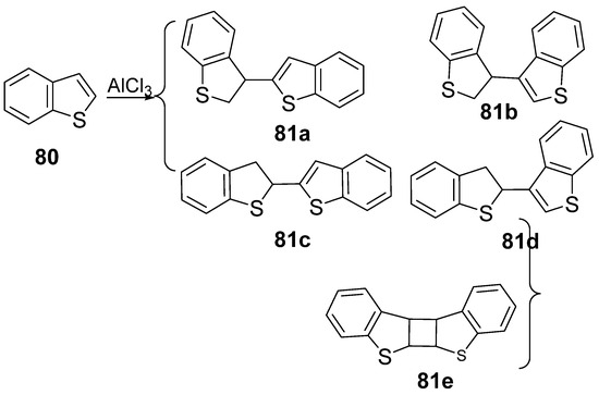 This type of dimerisation was also observed for the 2- and 3-methyl-substituted benzo[b]thiophenes [60]. Here, the two benzo[b]thiophene moieties were connected at their heterocyclic or carbocyclic moiety via the methyl groups.