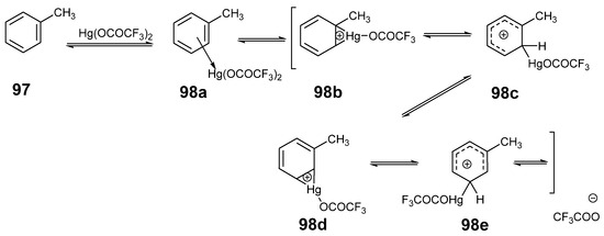 - Brown, H.C.; Wirkkala, R.A. Trifluoroacetic Acid as a Medium for Electrophilic Substitution Reactions. Rates and Isomer Distributions for the Bromination, Nitration, and Mercuration of Benzene and Toluene in Trifluoroacetic Acid. J. Am. Chem. Soc. 1966, 88, 1447–1452. [Google Scholar] [CrossRef]