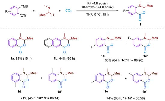 - Yoshida, H.; Hiroyuki, F.; Ohshita, J.; Kunai, A. CO2 Incorporation Reaction Using Arynes: Straightforward Access to Benzoxazinone. J. Am. Chem. Soc. 2006, 128, 11040–11041. [Google Scholar] [CrossRef]