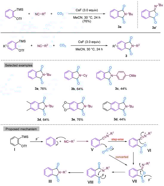 In 2014, Kaicharla’s group reported a CO2-involved three-component coupling reaction between phenylalkynes and isocyanides, resulting in the production of N-substituted phthalimides [22]. Although they expected an iminoisobenzofuranone derivative 3a due to the interception of the 1:1 adduct between aryne and isocyanide with CO2, a different final product was formed, namely N-tert-butylphthalimide 3a′, but still achieved a high yield of 76% (Figure 5). The reaction proceeds by the nucleophilic addition of isocyanide to the aryl hydrocarbon formed in situ from precursor I, leading to the generation of 1,3-amphiphilic intermediate V. This nucleophilic aryl anionic intermediate V can then progressively combine with the electrophilic carbonyl group of CO2 to form the amphiphilic ion VI, which subsequently closes the ring to generate the iminoisobenzofuranone derivative VII. However, the aryl anion V and CO2 can also undergo addition and cyclisation to form VII via a synergistic reaction, with the subsequent fluorination-induced ring-opening of VII generating the acidic fluorine intermediate VIII, which is further cyclised to give the phthalic acid imine derivative III (Figure 5). Previous studies have documented and elucidated the rearrangement of isoimine VII to imine III and a fluoride ion-induced rearrangement of isoimine VII to phthalimide III, which further confirms the authors’ claim [23,24]. In 2015, Yi’s group [25] also obtained phthalimide derivatives (Figure 6) under different conditions, but these derivatives differed from those produced by Kaicharla’s group in terms of their substrate suitability.