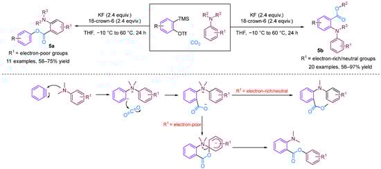 The Bhojgude group reported transition-metal-free MCC involving arynes [26], aromatic tertiary amines and CO2 (Figure 7). Interestingly, this reaction exhibits switchable selectivity depending on the electronic nature of the aromatic amines used. When using amines bearing electron-releasing/neutral groups as the nucleophilic trigger, the reaction afforded 2-arylamino benzoates via nitrogen to oxygen alkyl group migration. However, using electron-deficient amines in the reaction led to the production of 2-aminoaryl benzoates via the aryl-to-aryl amino group migration, resembling a Smiles rearrangement [27].