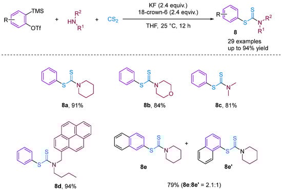 Recently, based on previous work, Bhojgude, Jindal and co-workers reported three-component coupling involving arynes [30], aliphatic amines and CS2 leading to the formation of S-aryl dithiocarbamates in high yield (Figure 10). Contrary to known aryne MCC involving amines and CO2, the present reaction proceeds via the initial addition of amines to CS2 followed by trapping with arynes to obtain the desired products. Detailed experimental and density functional theory studies have demonstrated the addition mechanism involved. Moreover, using 3-triflyloxybenzyne, a four-component coupling with the incorporation of THF was also observed.