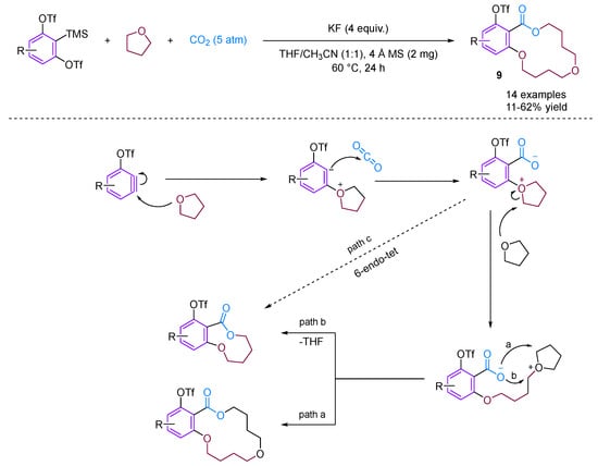 - Liu, H.; Jiang, H.; Qi, C. Macrocyclization of carbon dioxide with 3-triflyloxybenzynes and tetrahydrofuran: Straightforward access to 14-membered macrolactones. Chem. Commun. 2024, 60, 6639–6642. [Google Scholar] [CrossRef] [PubMed]