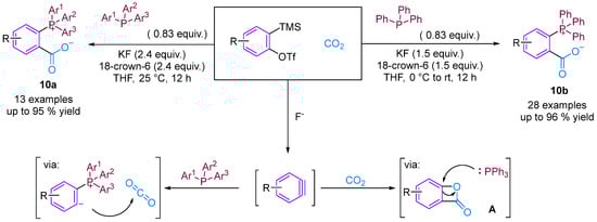 Considering the potential application of phosphonium salts as ligands, reagents, ionic liquids and organo-catalysts in organic synthesis, zwitterionic phosphonium benzoates developed using the aryne strategy are likely to have important applications [32,33]. Bhojgude, Roy and co-workers reported the triggering of transition metal-free aryne three-component coupling by phosphines using CO2 as the third component [34]. The reaction afforded zwitterionic phosphonium benzoates under mild and facile simple conditions instead of the envisioned benzooxaphosphol-3(1H)-ones. Mechanistically, in most cases, the initial phosphine–aryne zwitterion was trapped by CO2 to form carboxylates in high yield. He, Cai and colleagues prepared the corresponding zwitterionic phosphonium benzoates using a similar method [35]. However, He’s group views the reaction mechanism differently, proposing that the reaction occurs through two mechanisms. The first is similar to that reported by Bhojgude, and the second is via the [2 + 2] cycloaddition of benzyne and CO2 to generate intermediate A, which subsequently undergoes a ring-opening reaction with triphenylphosphine to produce the final product. Control experiments indicate the possibility of forming intermediate A (Figure 12).