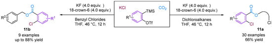 Recently, Qi, Jiang and their team developed a straightforward method for synthesizing a variety of structurally intriguing and valuable 14-membered macrocyclic lactones [31]. This is achieved through a carboxylative macrocyclization of 3-triflyloxybenzynes with CO2 and THF, while the novel [2 + 2 + 5 + 5] coupling reaction proceeds under transition metal-free conditions, forming one new C–C bond and three new C–O bonds in a single step (Figure 11).