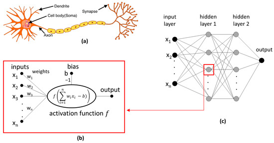 (a) Biological neuron (adapted from [82]), (b) artificial neuron, and (c) artificial neural network.