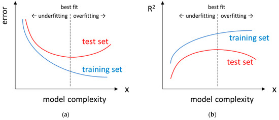 There is a generally accepted strategy for checking whether models are under- or overfitted. Before training the model, the dataset should be divided into at least two subsets, namely the training and test sets. Then, several models varying in complexity (e.g., the number of used descriptors) are developed using only the data from the training set, which means that at the training stage, the model ‘does not know’ about the existence of the test set. The test set is used to evaluate the optimised models. The prediction error is then plotted against the complexity of the model (Figure 4a). In the case of underfitted models, large errors occur in both the training and test sets. On the other hand, an overfitted model fits the training set too closely (unrealistically small error) and is therefore unable to make relatively good predictions for the compounds in the test set (resulting in a large error).