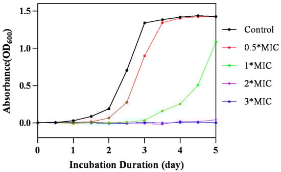 According to the literature [], the logarithmic phase of C. acnes was resuspended with fresh medium to a concentration of 105 CFU/mL. A specific amount of OCM was added to achieve concentrations of 0.5*MIC, 1*MIC, 2*MIC, and 3*MIC. The solvent was used as a vehicle control. Incubate at 150 rpm for five days at 37 °C while monitoring the OD600 value.