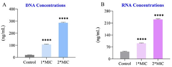 According to the literature [], C. acnes in the logarithmic phase was treated with OCM at 1*MIC and 2*MIC for 6 h. The supernatant was filtered through a 0.22-μm microporous filter and analyzed with a Nanodrop 2000 (Thermo Fisher Scientific, Waltham, MA, USA) to determine the release of DNA and RNA (measured at 260 nm and 230 nm).