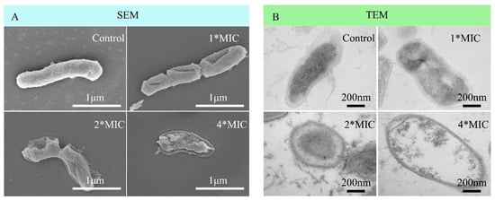 OCM altered the morphology and ultrastructure of C. acnes. After treatment with solvent or different concentrations of OCM (1*MIC, 2*MIC, and 4*MIC) for 6 h, the bacteria were collected, fixed, and prepared for electron microscopy analysis. The images from SEM and TEM are shown in panels (A,B), respectively.