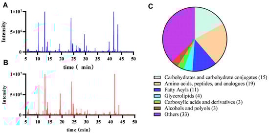 Metabolic profiling of C. acnes before and after EO treatment. (A) Typical total ion chromatograms of the metabolic profiles of C. acnes with solvent (control) derived from GC–MS. (B) Typical total ion chromatograms of the metabolic profiles of C. acnes with OCM (1*MIC). (C) Proportions and types of differential metabolites.