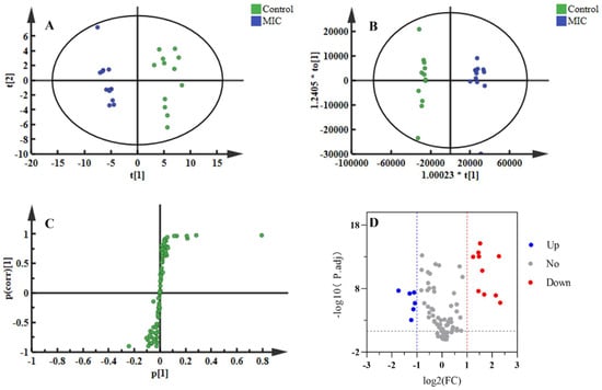 After peak recognition and deconvolution, metabolites were identified using NIST and Fiehn databases. Mass spectrometry data were normalized for subsequent analysis using internal standards. Based on the multiple changes compared to the control group, a combination of p-values from the standardized peak area two-tailed Student t-test and adjusted p-values after correction were used to select differential metabolites. PCA and OPLS-DA were performed to visualize metabolic changes. Finally, the enrichment analysis was conducted using MBROLE 2.0 software (https://csbg.cnb.csic.es/mbrole2/, accessed on 7 June 2023) with the identified differential metabolites, and the top 20 pathways were extracted for visualization.