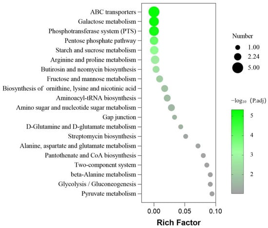Pathway enrichment analysis was conducted on 17 differential metabolites, resulting in 20 metabolic pathways (p.adj < 0.05), as shown in Figure 6. The top six pathways were ABC transporters, galactose metabolism, phosphotransferase system, pentose phosphate pathway, starch and sucrose metabolism, and arginine and proline metabolism. It was found that L-glutamic acid, D-glucose, D-fructose, L-proline, D-mannose, gluconic lactone, lactose, isomaltose, D-gluconic acid, and hydroxyproline were the critical intermediates in the metabolic pathway.