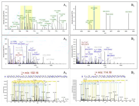 The MS and MS/MS spectra for the cinnamaldehyde-modified peptides. C. acnes was exposed to 1*MIC of OCM for 4 h, and the proteins of C. acnes were extracted for proteomic analysis. (A1,A2) represent the primary and secondary mass spectra of the cinnamaldehyde-modified peptide sequence ADVVLPVCLLEETSGTFLDWEHRPGR, which belongs to the protein A0A085B5J9. (A3) displays the peptide consensus view of b ions and y ions in the secondary mass spectrum. (B1,B2) display the primary and secondary mass spectra of the cinnamaldehyde-modified peptide segment, STLLHCITGLDSPTSGR, which belongs to the protein A0A828UH99 (B3), showing a peptide consensus view of b ions and y ions of the peptide in (B2).