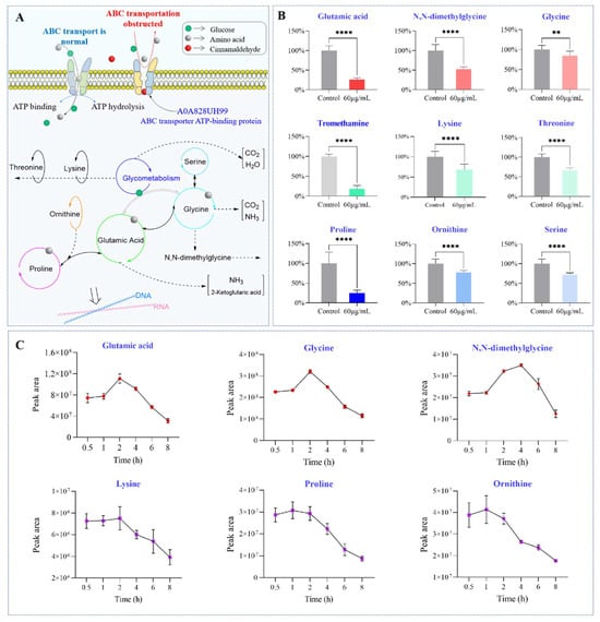 The effect of cinnamaldehyde covalently modifying ABC transporters on amino acids in bacteria. (A) Schematic diagram of ABC transporter proteins involved in transmembrane transport and metabolism of amino acid (B) Peak areas of amino acids of 1*MIC group and control group. C. acnes in the logarithmic growth phase was treated with OCM at 1*MIC for 6 h, and solvent was used as the vehicle control. The peak areas of indicated metabolites were quantified by GC–MS-based metabolomics. After normalizing the measured areas to the control group, the fold changes were used for quantification. (C) The contents of amino acid in bacterial cells after treatment with OCM. The peak areas of indicated amino acids were quantified by GC–MS-based metabolomics. The pooled data are presented as mean ± SEM of at least three independent experiments. ** p < 0.01, **** p < 0.0001.