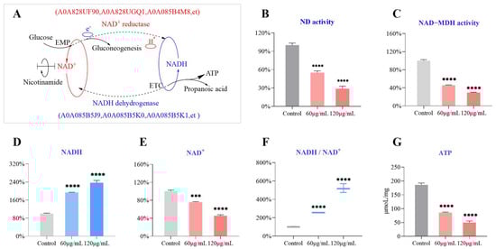 NAD (H) is a coenzyme that widely regulates biological processes such as cell growth, differentiation, energy metabolism, and apoptosis, as shown in Figure 9A. NAD+ is the primary hydrogen acceptor of EMP, and the generated NADH is transferred through the respiratory electron chain. While producing ATP, NADH is regenerated into NAD+ under the catalysis of dehydrogenase. The oxidation reactions of the three significant sugar, fat, and protein metabolites are mostly completed through this system. The levels of NAD (H) content and NADH/NAD+ ratio can be used to evaluate the strength of glycolysis. Under hypoxic conditions, elevated ratios of NADH/NAD+ result in the deactivation of multiple dehydrogenases, thereby inhibiting the glycolytic process. The colorimetric detection results of NAD+, NADH, and NADH/NAD+ ratios in bacterial cells treated with OCM are shown in Figure 9B. Compared with the control group, OCM decreased cellular NAD+ levels while significantly increasing NADH and the NADH/NAD+ ratio (p < 0.05). NADH dehydrogenase activity and the change in intracellular ATP content were determined. NADH dehydrogenase activity and ATP levels decreased significantly. The results are shown in Figure 9B–G. After treatment with OCM, the activities of NADH dehydrogenase in the 1*MIC and 2*MIC groups were reduced by approximately 46.2% and 71.0%. Additionally, the ATP levels in the 1*MIC and 2*MIC groups exhibited reductions of 52.8% and 73.6%, respectively. Furthermore, the activity of the NAD-dependent malate dehydrogenase (MDH) enzyme significantly decreases with the increase of OCM concentration, confirming the decrease in NAD content from another perspective. When the NADH/NAD+ ratio in the matrix is high, it will cause a decrease in respiratory chain electron transfer function and thus affect the cell’s ATP synthesis ability, leading to a decrease in ATP levels. In these cases, bacteria are in an oxidative stress state [], ultimately leading to cell necrosis or apoptosis. A0A085B5J9 is a NADH-quinone oxidoreductase. The cinnamaldehyde in OCM inhibits NADH quinone oxidoreductase activity by covalently modifying A0A085B5J9 to block oxidative phosphorylation, limit ATP production, and thus prevent the growth of C. acnes.