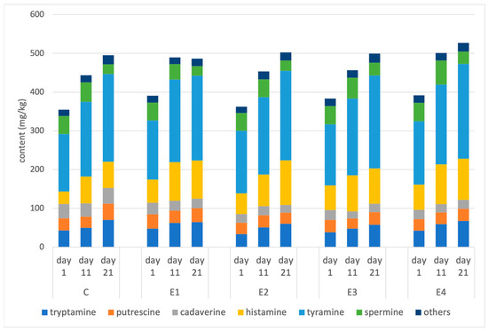 The addition of plant extracts did not influence the content of biogenic amines in the sausages. On average, at the beginning of storage, the sausages contained 377 mg/kg of amines, which increased to 469 and 502 mg/kg after 11 and 21 days of storage, respectively. The observed increases are a result of enzyme activity: the liberation of free amino acids by endogenous proteases, their subsequent decarboxylation to amines by and in some cases, subsequent transformations by bacterial enzymes [23,24]. Tyramine was the most abundant of the amines, comprising about 40% of total content, with final levels exceeding 200 mg/kg, followed by histamine and tryptamine. An overview of the levels of individual analytes is presented in Figure 1, and the detailed data along with statistical analysis are presented in Table S1 in the Supplementary Materials.