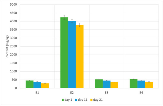 Acerola and pepper were the sources of carotenoids in the sausages [14,34,35]; the total content of these compounds in raw materials were 16.1 and 194 mg/kg, respectively. The total content of carotenoids in sausage E4 decreased during storage from 3.12 to 2.14 mg/kg, while in the rest of the sausages, levels were below the limit of quantification (0.5 mg/kg).