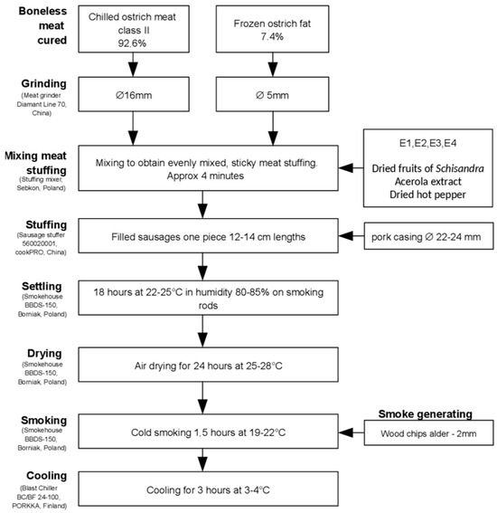 Meat and fat were obtained from the meat processing company Strusia Kraina & MOBAX Sp.j. (Katowice, Poland) from 20 ostriches with a preslaughter weight of 90 to 130 kg. After overnight chilling at a temperature of −2 °C to 0 °C, approximately 30 kg ostrich meat class II (meat separated from bones, the whole carcass, without membranes and ligaments) and 3 kg ostrich fat (pure fat without membranes) were collected in three separate trials. Ingredients such as dried fruits of Schisandra chinesis (Nanga, Złotow, Poland), acerola (Malpighia glabra L.) extract standardized to 17% vitamin C (Nanga), dried hot peppers (Capsicum annuum L.) (Chili-Trade KFT, Batya, Hungary), natural sausage pork casings (EMAS, Dąbrowa Górnicza, Poland) and curing salt (EMAS) were purchased from a local market.