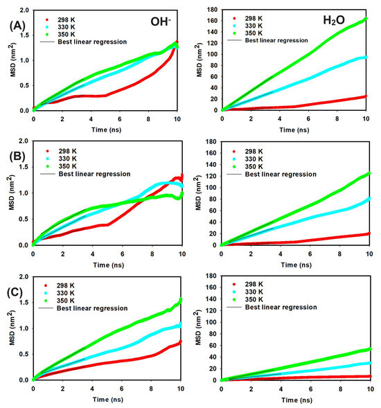 - Dubey, V.; Maiti, A.; Daschakraborty, S. Predicting the solvation structure and vehicular diffusion of hydroxide ion in an anion exchange membrane using nonreactive molecular dynamics simulation. Chem. Phys. Lett. 2020, 755, 137802. [Google Scholar] [CrossRef]